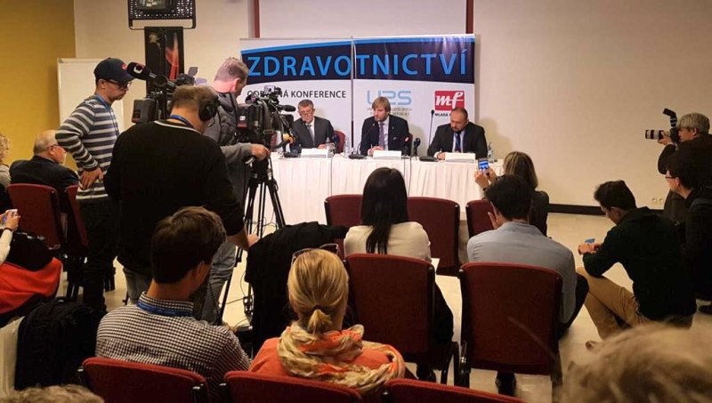 Přicházíme právě včas na začátek tiskové konference ohledně podpory studií nelékařských profesí s ministrem zdravotnictví a předsedou vlády ČR.